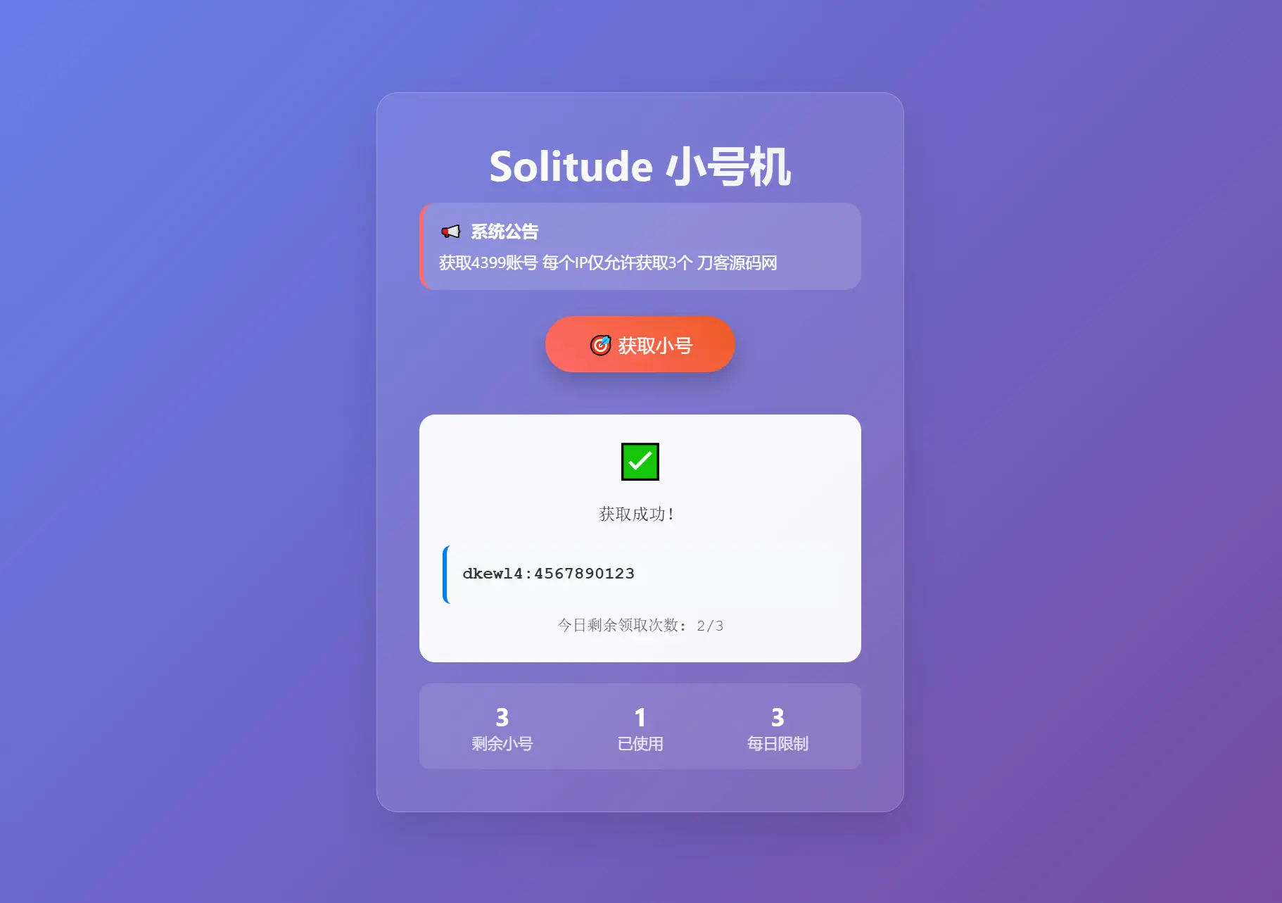此为小号分发卡密系统源码,专用于分发小号库存账号或卡密等使用,不过规定每个IP仅能领取3次,也可视作小号分发工具。